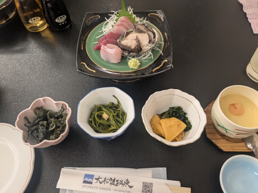 夕食は大船渡温泉でお客様に提供されているものと同じご飯をいただきました。アワビ、お刺身、わかめ、めかぶなど海鮮が盛りだくさんでした。わかめは社長が育てているそうで、分厚くておいしかったです。ホヤは初めていただきましたが、美味しかったです。ほかにも天ぷらや茶わん蒸しもあって、おなかがいっぱいになりました。