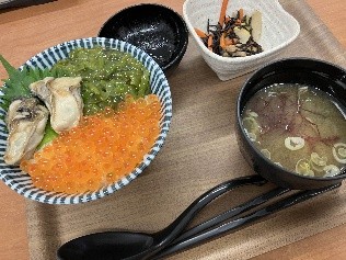 昼食には、道の駅内の「たかたのごはん」で一番人気メニューの「たかた丼」をいただきました。たくさんの海産物がのっており、大満足でした。