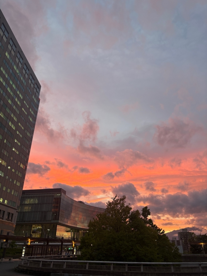 盛岡駅からのバスに乗る時のバスロータリーの空がとても綺麗で、岩手っていいなとしみじみと感じた瞬間でした。あっぴリレーマラソンを見て私も走りたいと思ったので、社員は無料で使えるジムで1時間ランニングしてきました。