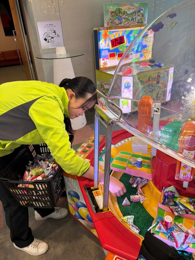 店の拭き掃除やゲームセンターのお菓子の賞味期限チェックをしたり、商品補充や倉庫に在庫を取りに行ったりしました。