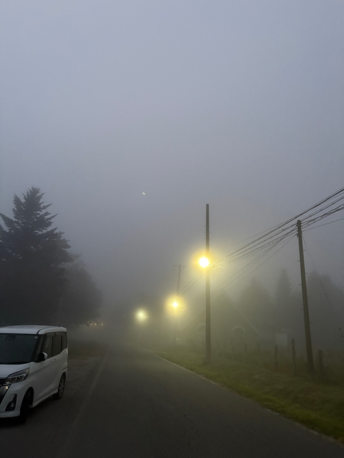 朝日を見たいと思い朝早くにグランピングエリアに行ったのですが、霧がとても濃くて気温も8℃しかなく、異世界のような空間でした。